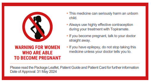 Topiramate is now contraindicated in pregnancy and in women of childbearing potential unless the conditions of a Pregnancy Prevention Programme are fulfilled.